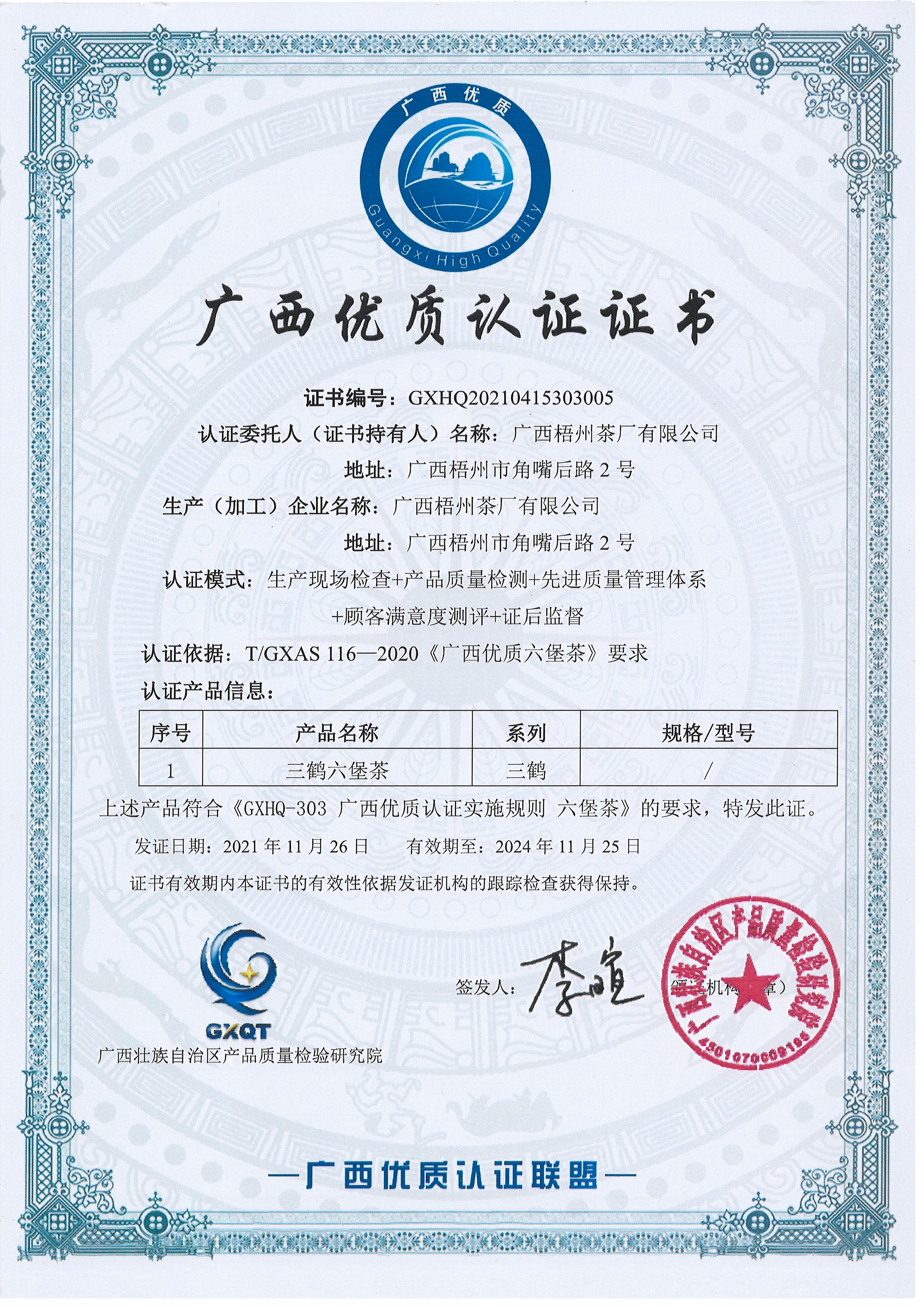 廣西梧州茶廠有限公司獲得廣西優(yōu)質(zhì)認(rèn)證證書