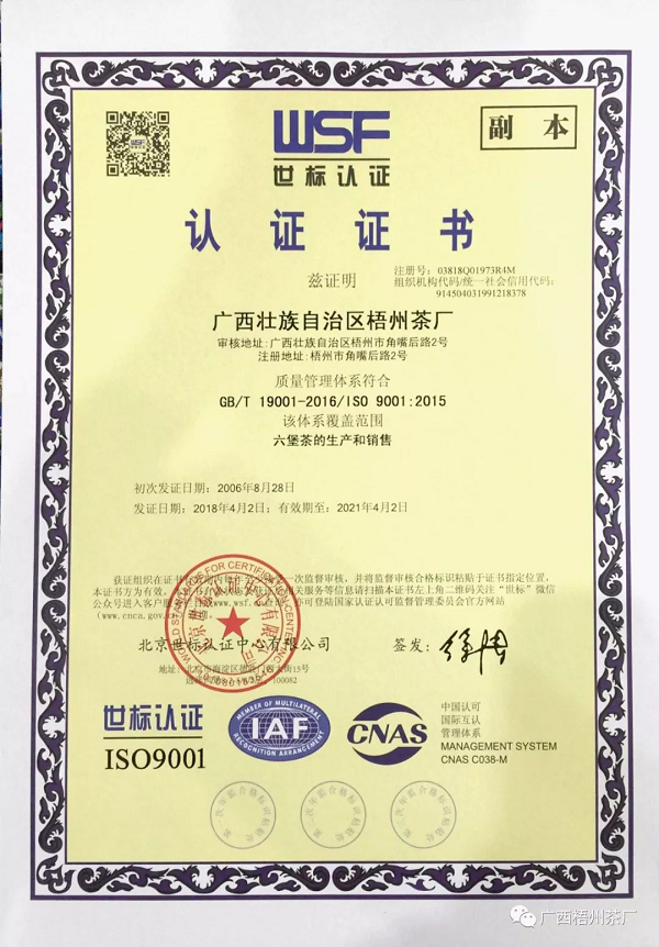 快訊 | 梧州茶廠獲得新版質(zhì)量管理體系認(rèn)證證書(shū)